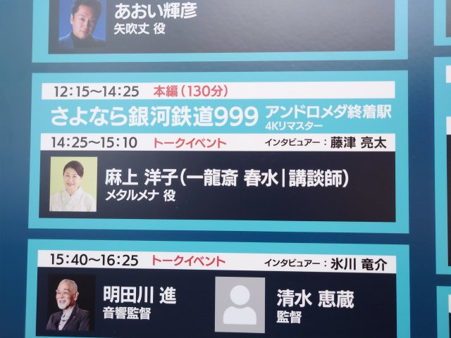 | 名古屋のミッドランドシネマスクエアの映画館にて「第2回どまんなかアニメ映画祭」が開催され、劇場版「さよなら銀河鉄道999-アンドロメダ終着駅-」の上映があり、トークゲストでメタルメナ役の麻上洋子さんが登場、当時の「銀河鉄道999」収録などエピソードをお話してくれました。 | |