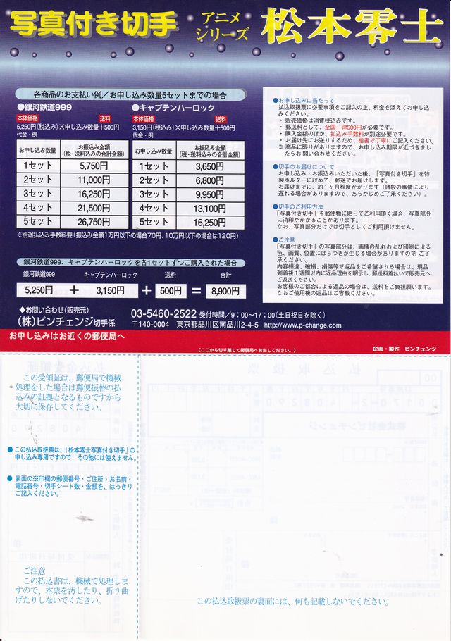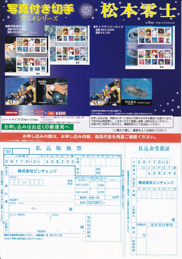 ピンチェンジ「漫画家活動50周年 松本零士 写真付き切手アニメシリーズ」払込取扱票