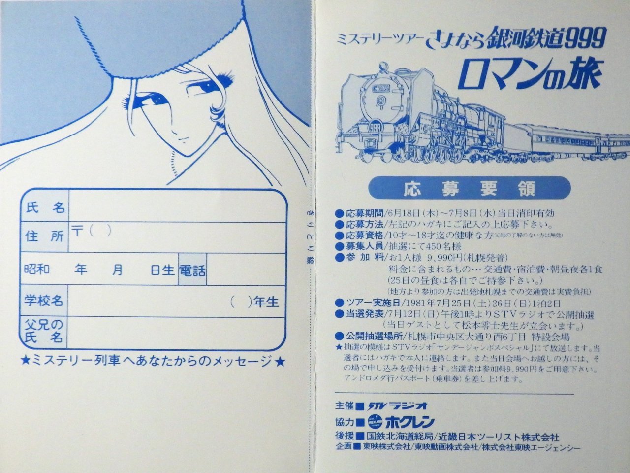 氏名、住所、生年月日、電話、学校名、父兄の氏名、ミステリー列車へあなたからのメッセージ |