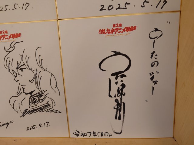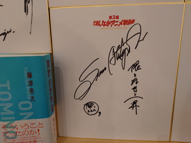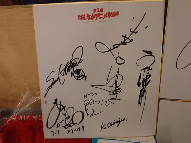 Facebook「銀河鉄道999」のグループ内の有志のオフ会がお開きになりまして、次は「ど真ん中アニメ映画祭」の「アフターパーティー」に申込みして参加してきましたが、こちらは各分野のアニメの専門家、ファンの集まりでしたので、個人的には他の作品は疎く、詳しくも無いので話し相手が見つからず、一人で黙々と食事していました。そうしたら、Facebookでつながりのある「アニメワールドスター」代表者の方が途中からお見えになり挨拶してきました。 こちらのアフターパーティーにゲストで麻上さんが参加することを期待していましたが、トークショーが終わって2時間ほど空いているので、サイン色紙だけ残してお帰りになったようでした。他の方の声優さんのサイン色紙もありましたが、詳しくないので誰なのかも分からず・・・。 アフターパーティーも、1次会のオフ会でしっかり食事をしているので、そんなに食べることも出来ずに時間が過ぎていくのを待っていたら、サイン色紙の抽選会が始まりまして、麻上洋子さんのサイン色紙が欲しかったのですが他の方に渡ってしまい、私は「あしたのジョー」の主人公・矢吹丈の声を担当した俳優・声優の あおい輝彦さんの筆ペンのサイン色紙が当たりました。どうも大変貴重らしく、他の方々が一番欲しかったサイン色紙だったようです。抽選会終了後も近くで見たいと申し出もあったりして、ファンでもない私がもらってもうしわけないと思いつつ帰宅しました。 |