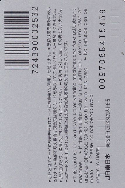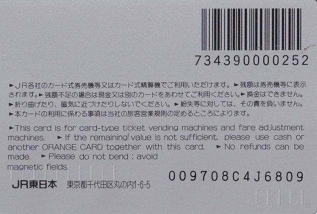 | 平成9年9月9日で999記念として、JR東日本管内で発売されたオレンジカードです。 | |