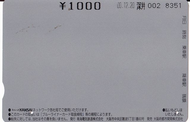 泉北高速鉄道から発行された大阪府立大型児童館ビッグバンのキャラクターと松本先生がデザインしたペイント列車のブルーライナーカードを保管しています。
