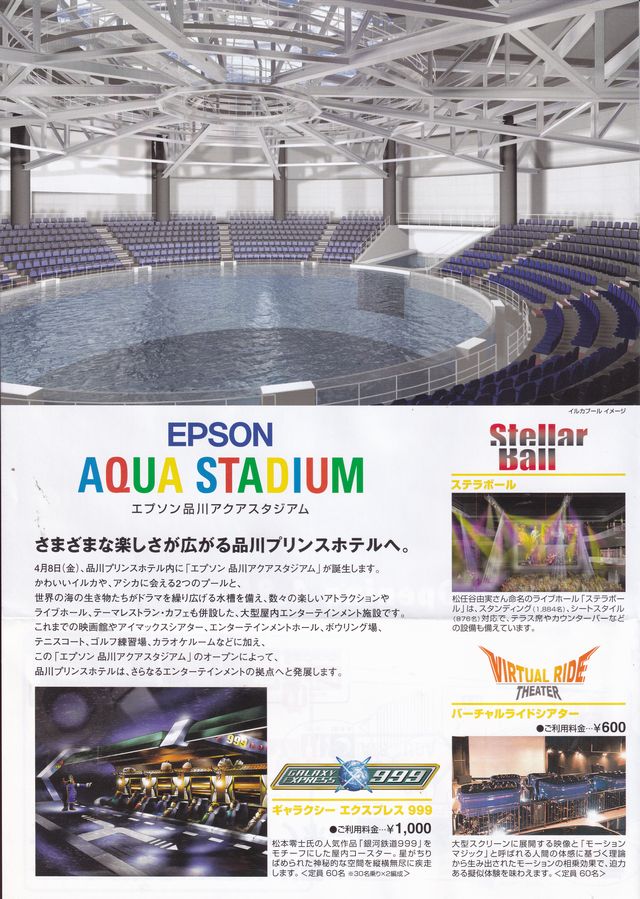品川プリンスホテルアクアスタジアムが2005年4月3日にオープンしたときの宣伝チラシです。ジェットコースター「ギャラクシーエクスプレス999」開業時のチラシを保管しています。