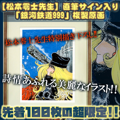 「銀河鉄道999」をはじめ、「宇宙戦艦ヤマト」や「キャプテン・ハーロック」などの原画や版画を松本零士氏の直筆サイン入りで紹介します。 |