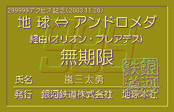当社創立(1997年8月23日)以来、2003年11月20日で、299999アクセスを突破しました。見事記念すべき299999人目の方は、嵐三太勇さんでした。当社より記念の限定パス(名前入り)を発行し、ここに当社が倒産しない限り永久に展示いたします。 前回289999アクセスから、30日で299999アクセス達成です。199999アクセスからは、10ヶ月と20日です。 |