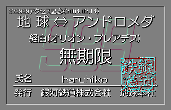 当社創立(1997年8月23日)以来、2004年2月14日で、329999アクセスを突破しました。見事記念すべき329999人目の方は、haruhikoさんでした。当社より記念の限定パス(名前入り)を発行し、ここに当社が倒産しない限り永久に展示いたします。 前回319999アクセスから、23日で329999アクセス達成です。 |