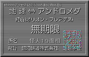 当社創立(1997年8月23日)以来、2005年07月06日で、459999アクセスを突破しました。見事記念すべき459999人目の方は、怪人19面相さんでした。当社より記念の限定パス(名前入り)を発行し、ここに当社が倒産しない限り永久に展示いたします。 前回449999アクセスから、1ヶ月と13日で459999アクセス達成です。 |