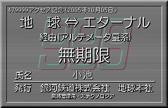 当社創立(1997年8月23日)以来、2005年10月05日で、479999アクセスを突破しました。見事記念すべき479999人目の方は、小池さんでした。当社より記念の限定パス(名前入り)を発行し、ここに当社が倒産しない限り永久に展示いたします。