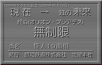 当社創立(1997年8月23日)以来、2006年05月28日で、529999アクセスを突破しました。見事記念すべき529999人目の方は、怪人19面相さんでした。当社より記念の限定パス(名前入り)を発行し、ここに当社が倒産しない限り永久に展示いたします。