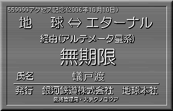 当社創立(1997年8月23日)以来、2006年10月10日で、559999アクセスを突破しました。見事記念すべき559999人目の方は、蟻戸渡さんでした。当社より記念の限定パス(名前入り)を発行し、ここに当社が倒産しない限り永久に展示いたします。