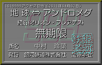 当社創立(1997年8月23日)以来、2011年04月02日で、1019999アクセスを突破しました。見事記念すべき1019999人目の方は、中村玲菜さんでした。当社より記念の限定パス(名前入り)を発行し、ここに当社が倒産しない限り永久に展示いたします。