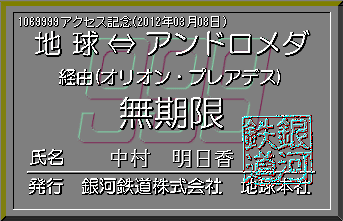 当社創立(1997年8月23日)以来、2012年03月08日で、1069999アクセスを突破しました。見事記念すべき1069999人目の方は、中村 明日香さんでした。当社より記念の限定パス(名前入り)を発行し、ここに当社が倒産しない限り永久に展示いたします。