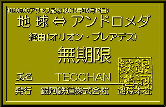 当社創立(1997年8月23日)以来、2012年06月15日で、1099999アクセスを突破しました。見事記念すべき1099999人目の方は、TECCHANさんでした。当社より記念の限定パス(名前入り)を発行し、ここに当社が倒産しない限り永久に展示いたします。