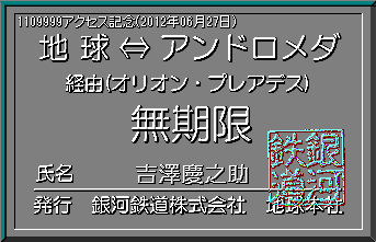 当社創立(1997年8月23日)以来、2012年06月27日で、1109999アクセスを突破しました。見事記念すべき1109999人目の方は、吉澤慶之助さんでした。当社より記念の限定パス(名前入り)を発行し、ここに当社が倒産しない限り永久に展示いたします。