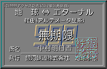 当社創立(1997年8月23日)以来、2017年01月08日で、1289999アクセスを突破しました。見事記念すべき1289999人目の方は、中村明日香さんでした。当社より記念の限定パス(名前入り)を発行し、ここに当社が倒産しない限り永久に展示いたします。 |
