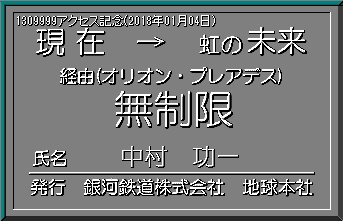 当社創立(1997年8月23日)以来、2018年01月04日で、1309999アクセスを突破しました。見事記念すべき1309999人目の方は、中村功一さんでした。当社より記念の限定パス(名前入り)を発行し、ここに当社が倒産しない限り永久に展示いたします。 |