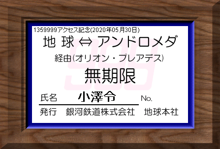 当社創立(1997年8月23日)以来、2020年05月30日で、1359999アクセスを達成しました。見事記念すべき1359999人目の方は、小澤令さんでした。当社より記念の限定パス(名前入り)を発行し、ここに当社が倒産しない限り永久に展示いたします。