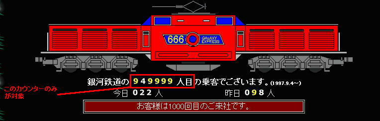 | 999アクセスは、10000アクセス毎にカウントされますが、そのカウントの対象は、以下のアクセスカウンターとなります。これ以外のカウントは対象外です。 |