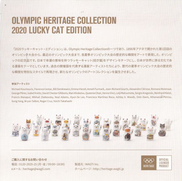 WAGTIは、2017年に装飾、磁器類のオリンピックヘリテージコレクションのライセンス契約を締結後、平昌2018オリンピック競技大会でも商品を発売しております。そして本日、WAGTIは、平昌2018オリンピック競技大会に続き、2つ目のオリンピックヘリテージコレクションである「2020 Lucky Cat Edition」を、発売する運びとなりました。