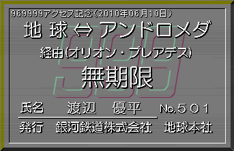 当社創立(1997年8月23日)以来、2010年06月10日で、969999アクセスを突破しました。見事記念すべき969999人目の方は、渡辺優平さんでした。当社より記念の限定パス(名前入り)を発行し、ここに当社が倒産しない限り永久に展示いたします。