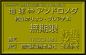 当社創立(1997年8月23日)以来、2014年06月29日で、1229999アクセスを突破しました。見事記念すべき1229999人目の方は、TECCHANさんでした。当社より記念の限定パス(名前入り)を発行し、ここに当社が倒産しない限り永久に展示いたします。 |
